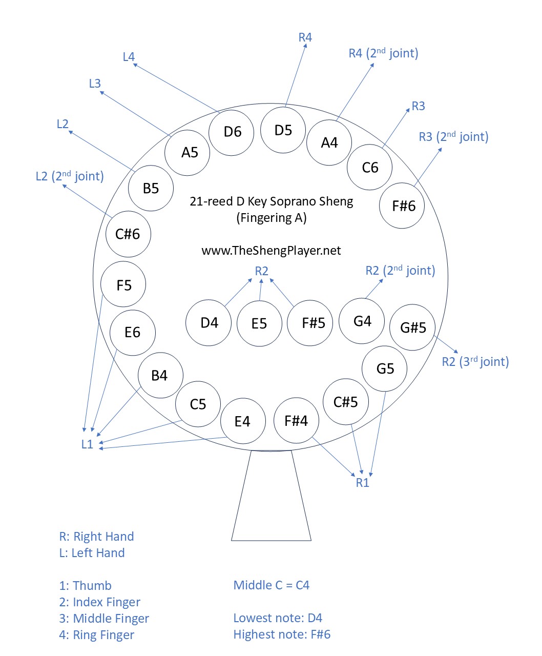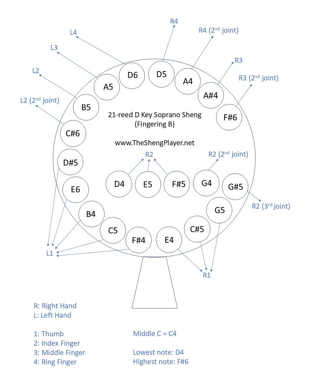 I own two 21-reed Shengs, but the fingering is slightly different. Fingering B is the fingering of my first 21-reed Sheng (Sheng maker’s fingering) and Fingering A is the fingering of my second 21-reed Sheng (my preferring fingering). The above two fingering charts are for your reference and the fingerings might slightly differ for different 21-reed Shengs made by different makers.
